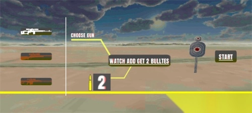 3、游戏开始后注意右侧靶标,点击"START"按钮进行射击,剩余子弹数显示为2,需谨慎把握每次射击机会。