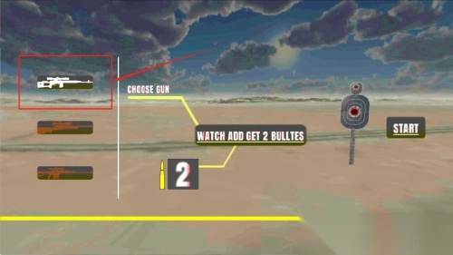 2、在武器选择界面,查看红框选中的当前枪械,点击"WATCH ADD"观看广告可额外获得2发子弹补给。