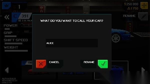 2、可从车库中挑选喜爱的车辆取昵称,昵称会在比赛结束时显示。
