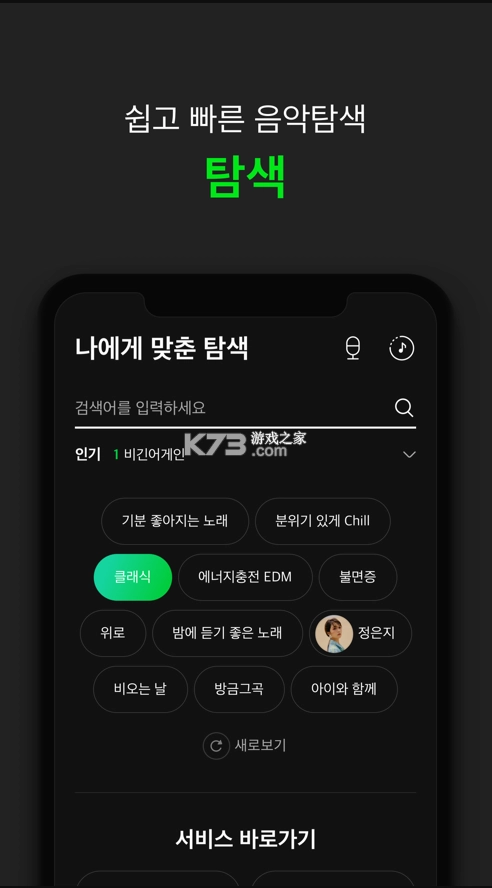 韩国歌曲播放软件,为用户们提供丰富的高人气音乐,整合歌曲、MV、专辑等内容,掌握最新流行歌曲趋势,内容全面,音乐更新快,量身定制特色专辑内容,音质内容也是非常不错的