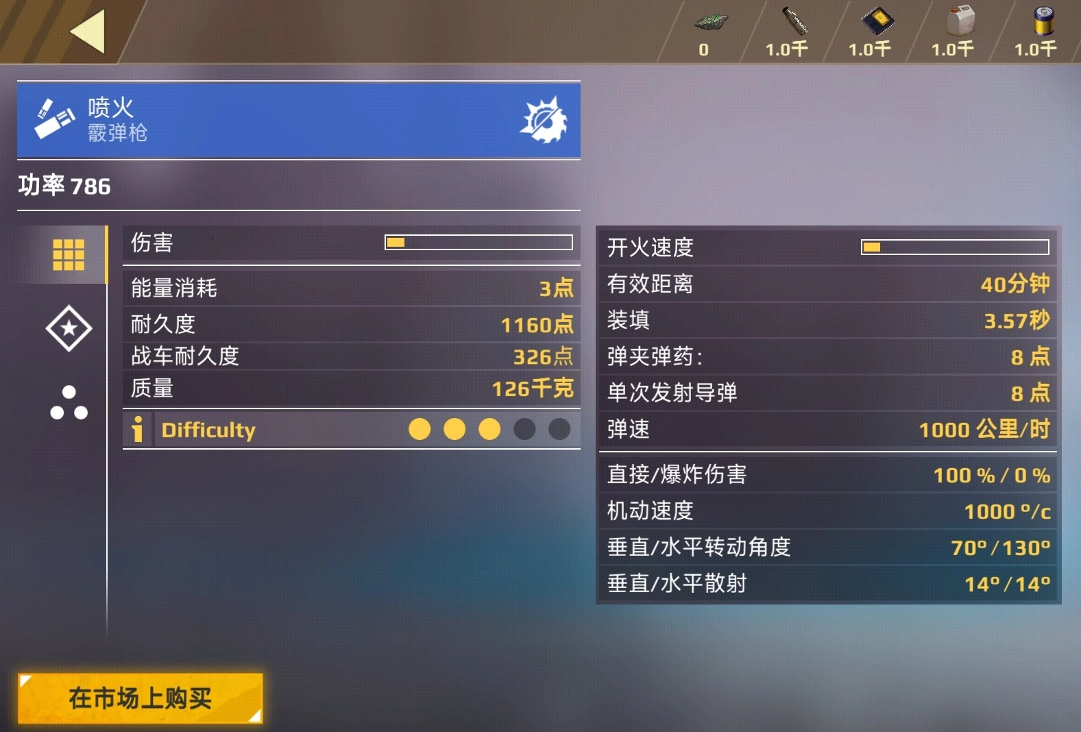 就像上图里的“喷火”霰弹枪,其耐久度相较于“巨锤”提高到了1160,同时还具备326点战车耐久度。不仅如此,它的弹夹里有8发弹药,每次能发射8枚弹丸,单次射击的火力投射能力比“巨锤”提升了33.3%,全弹夹射击更是提升了166.67% 。