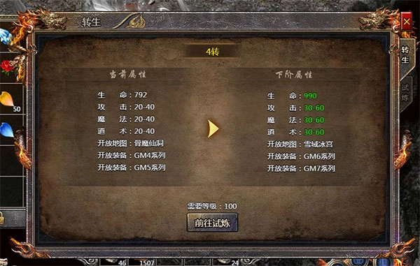 2. 转生突破:达到 5 转后,角色属性将实现飞跃(需持有转生证明)。