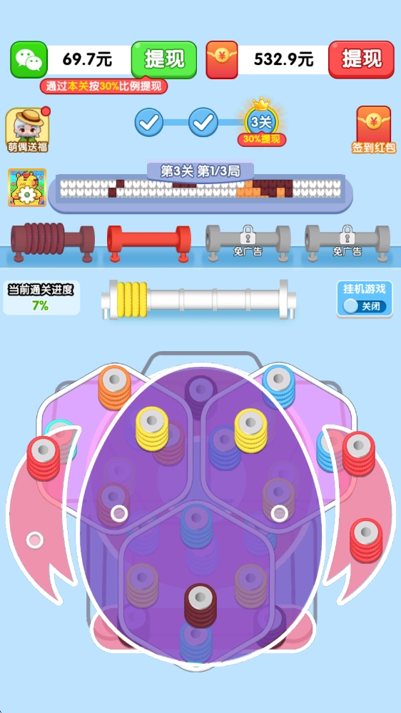 这款游戏在传统打螺丝玩法基础上做了创新,把消除机制换成了编织毛线的形式。核心玩法其实没太大变化,但游玩体验会显得格外新鲜有趣。更特别的是,每通过一个关卡,就相当于完成了一件编织作品,这种设计让游戏过程充满了独特的乐趣。