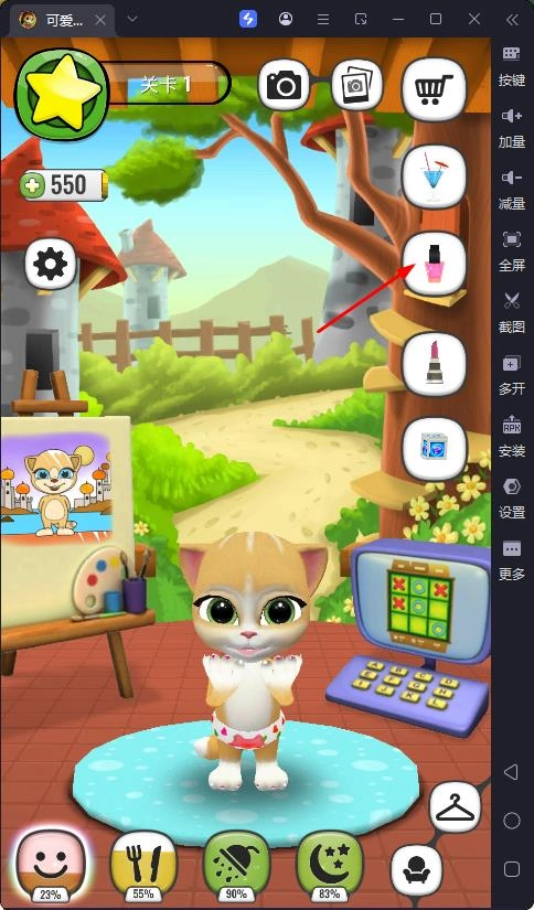 可以在互动界面和艾玛一起做抛球、梳毛这类游戏,慢慢积累亲密度就能解锁新的互动动作,还能用道具来满足它的一些小需求。