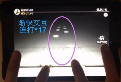 这里的交互连打估计挺让人犯难的吧。连打刚开始速度很慢,会慢慢加快,最后稳定在16分的节奏上。得把节奏的渐变拿捏好,可别抢拍。要是实在把握不准,记住这点也行:总共要连打17次!打完马上就是一个双押,得接稳了,可不能慌慌张张的。