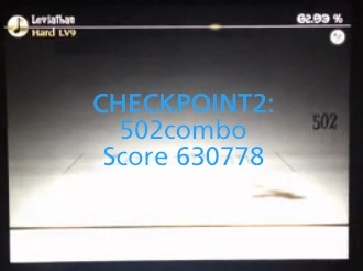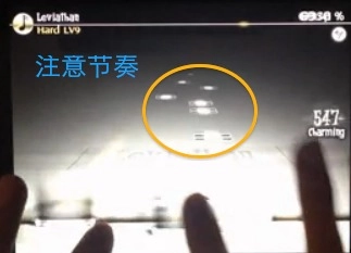 第二张特写镜头。能看到最后三个节奏要更快些。这里既可以通过目押操作,也能依靠听音乐形成的反射弧来击打。