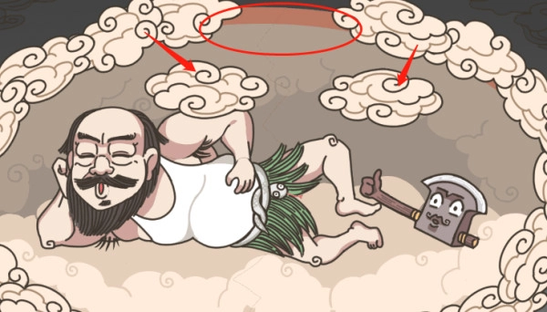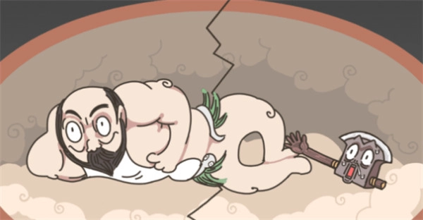 进入游戏后,能看到盘古正睡在一个云团似的蛋壳里,他的脚边还放着一把斧头,那便是开天辟地的工具。
