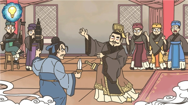 长按红色柱子并向右拖动,将秦王的佩剑移交给荆轲,待一段背景音乐播放完毕后即可通关。