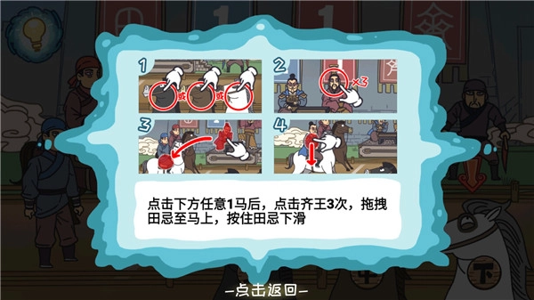 点击下方任意一匹马后,点击齐王三次,把田忌拖到马上,按住田忌向下滑动就可以了。