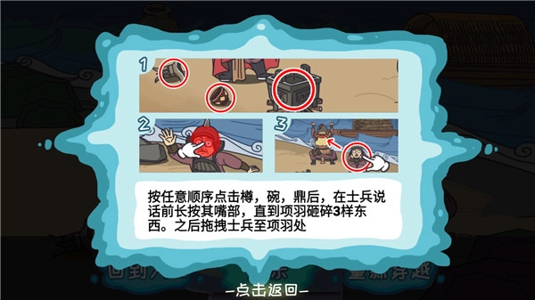 先按任意顺序点击樽、碗、鼎这三样物品,接着在士兵开口说话之前,长按他的嘴部,一直保持长按状态,直到项羽把这三样东西都砸碎。完成这些步骤后,再将士兵拖拽到项羽所在的位置,就能顺利通关了。