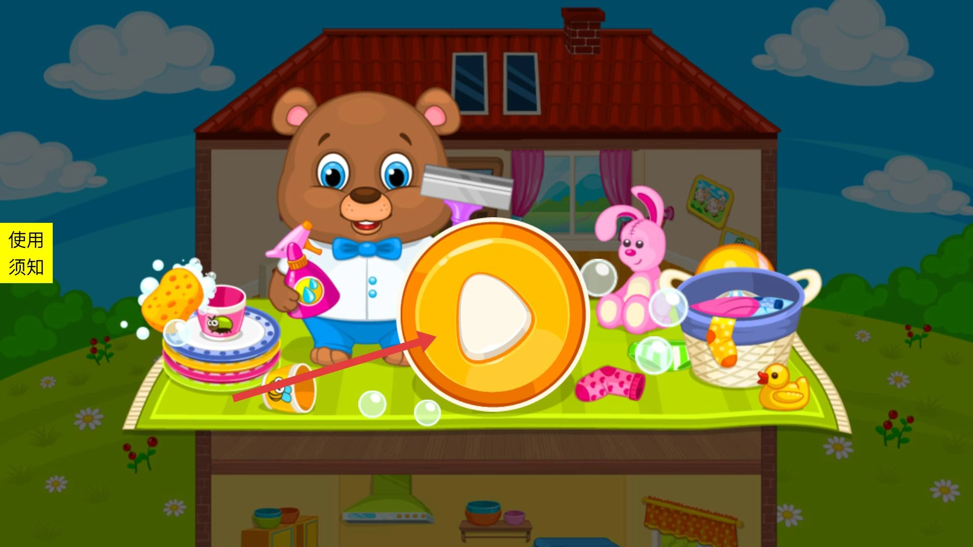 玩家点击播放按钮启动游戏,跟着小熊的指引,借助工具清理各种物品,感受做家务的乐趣。