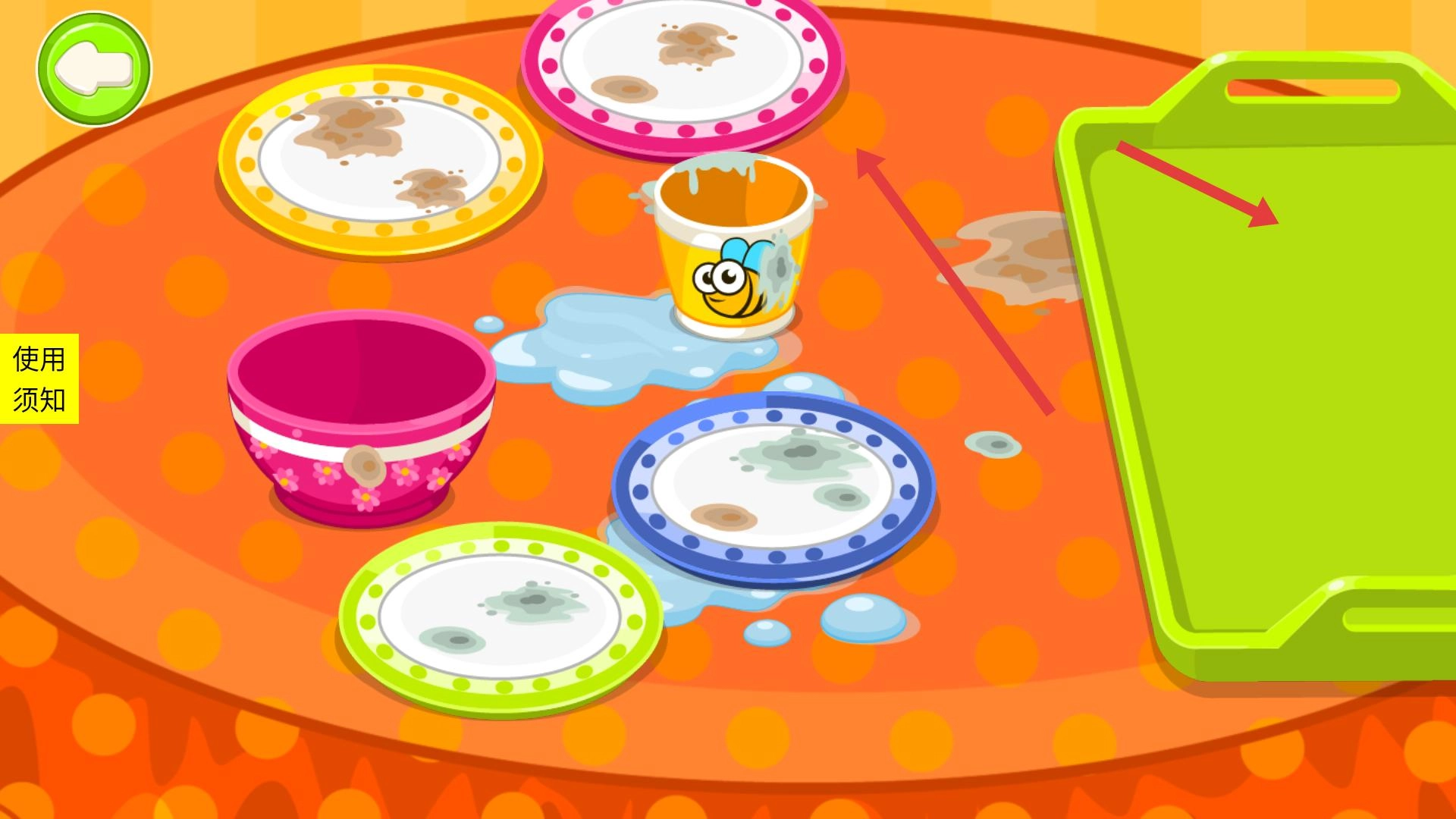 把脏餐具拖到绿色托盘上,做好分类整理,接着用清洁工具将其洗净,同时保持桌面的整洁,这样就完成任务了。