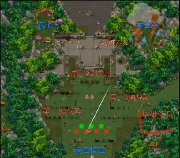 寻宝:我军任意角色行至(22.8)区域附近时,会触发暗道出现,此时孙坚需移动到高亮标记的位置;之后前往(30.3)处可获取凡品破风刀。当我军任意角色靠近(13.8)位置时,暗道会再次显现,孙坚需移动至该暗道附近;接着前往(8.3)处可获得凡品虎狼盔。