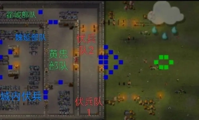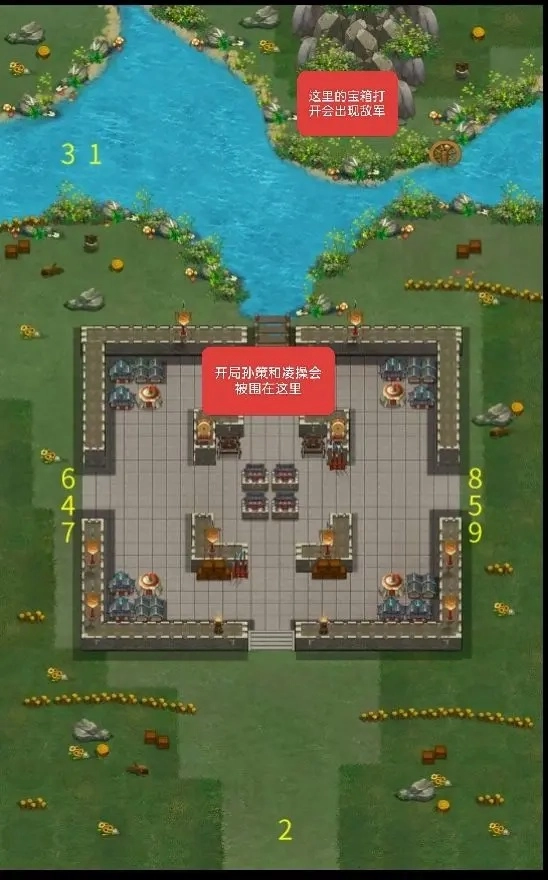 ①在开局击杀掉三个骑兵并打开宝箱后,我军韩当需要前往埋伏地点,暂时从战场撤离。与此同时,张咨会登场。 ②我军行进到村庄附近时,会有一队骑兵出现。此时我军要退到河对岸,以此引诱敌军前来进攻。当敌军人数不足五人时,会收到提示让孙坚撤退到右下角位置,等孙坚到达后,韩当的伏兵就会出现。