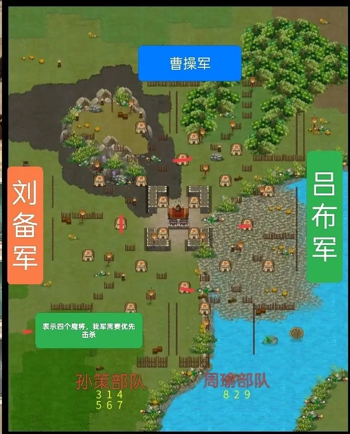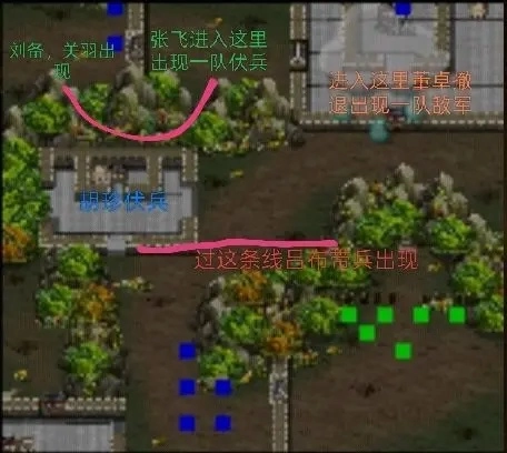 ①我军歼灭对面全部骑军后,孙策若先进入(28.13-14)区域的左侧,会触发敌军伏兵——吕布、张飞等大批敌军会突然出现包围我军,同时还会有两道城门落下将我军分割,导致我军全体士气下降。因此,在除孙策外的其他我方部队都进入该区域前,孙策切勿提前进入,避免被敌军集火击杀。正确的做法是让其他部队先进入,孙策最后一个进入即可。