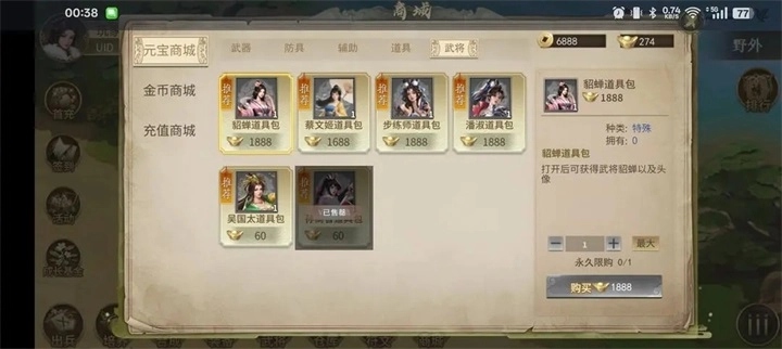 点击商场,然后依次选择元宝商场、道具/武将就能找到。温馨提示:要是你购买了孙尚香后发现站位不足,只需退出游戏,再重新点击开始游戏进入,站位就会恢复正常了。