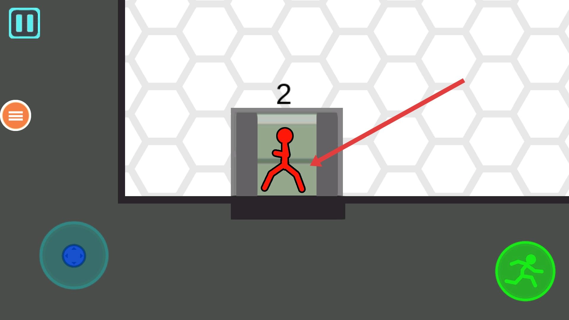 电梯运行结束后,火柴人抵达第二关的初始位置,这时能再次借助蓝色圆盘调整方向,点击绿色奔跑按钮,就能让火柴人从第二关的起始点继续挑战关卡。
