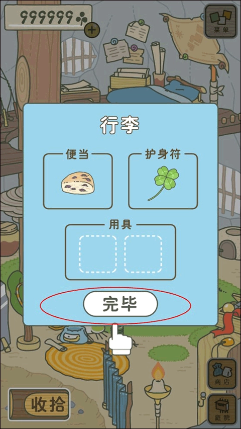 把要给蛙蛙准备的吃的、护身符以及其他用品都给它带上,确认都弄好后点击完成就可以啦。(给蛙蛙搭配不同的用品,它寄回来的特产和明信片说不定会不一样哦)