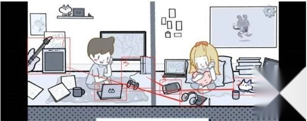 要点出两个人共同拥有的物品,像他们的游戏机、吉他、耳机以及两只猫咪都算在内;除了这几样物品外,还有三个深层话题,需要连续滑动鼠标滚轮才能查看。