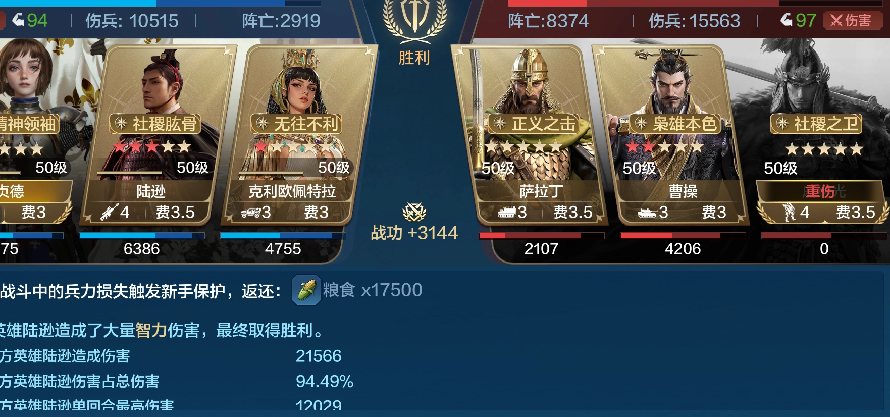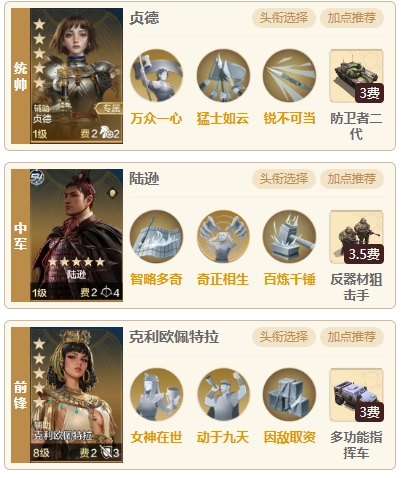 在第四纪元时,陆逊主动队就已频繁登场,算是当时的热门阵容之一,不过搭配克利欧佩特拉的情况相对少见。选用克利欧佩特拉,既能满足“猛士如云”对三个兵种的要求,还能带来一定的增伤与减伤效果。“统帅三军”和“兵精将广”这两个buff虽然强度可观,但并不适配这套阵容——这套阵容的核心思路,是依靠陆逊的超高伤害抢占先手,快速压低敌方兵力;即便无法在1-2回合内完成击杀,也能打掉对手的大部分兵力。