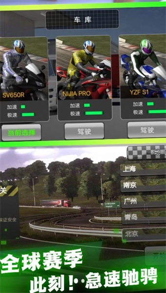 2、丰富多元的游戏赛道:玩家可以驾驶摩托车驰骋于车水马龙的城市街道、曲折起伏的山路等各类赛道,尽情感受速度与激情的绝妙融合。