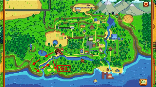 5、从自家农场出发,沿着下方的路往南走,之后稍微往右走一点,会看到两座小木桥,从桥上走过去。