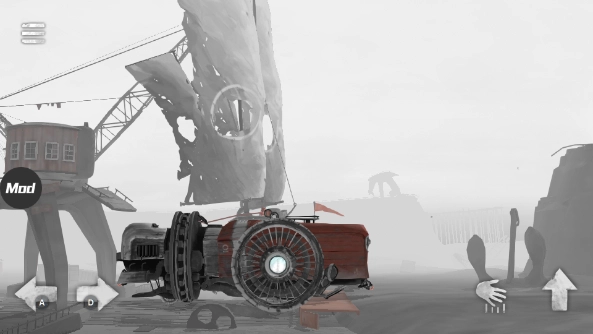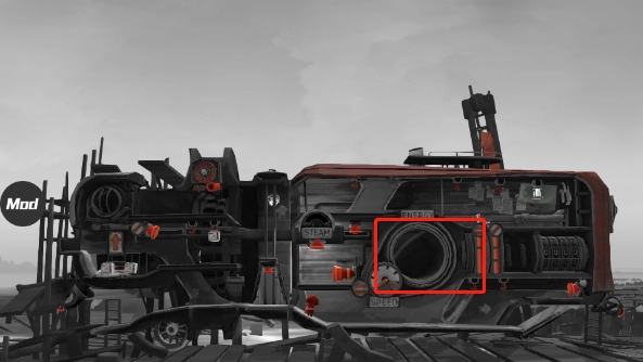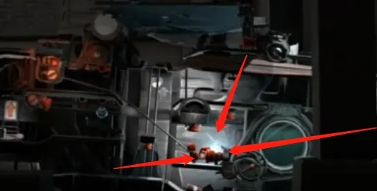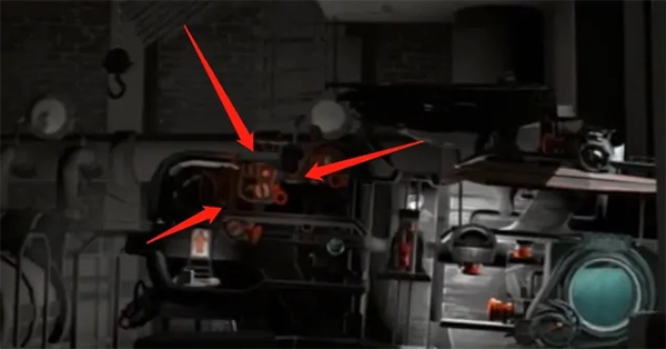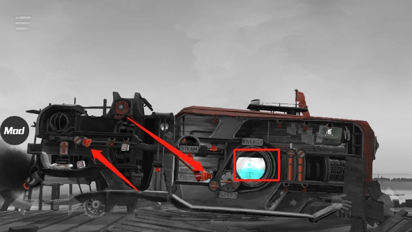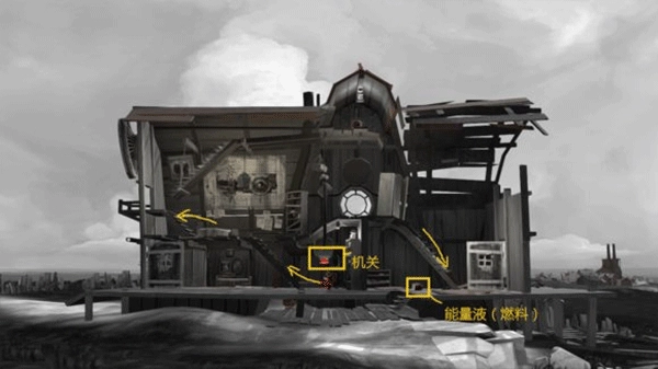 图中被高亮标注的部分是机关,呈现橙红色,所有图里的机关都是这个颜色。由于人仅能操控前后移动和跳跃这两个动作,所以按钮的操作方式大致就是顶、踩、推这几种。能量液是用来驱动后面的“房车(帆车)”的。它不直接被称作燃料,因为之后还能用于灭火,若叫燃料会显得有些违和。