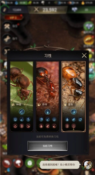 1、种植习性:玩家等级达到7级后,可自主选择一次习性,该选择将决定后续的发展路径。首次选择后3天内无法更换,但3天后可免费更换一次。种植习性属于发展偏向型,选择后,即便夜晚遭遇偷袭,也能保障资源不会被全部掠夺;同时工蚁的劳作效率、采集速度和负重能力均会提升约一倍。不过该习性存在负面效果:作战用的兵蚁战斗力与防御力会显著下降,且战斗时行军速度也会变慢。种植习性更适合玩家前期快速发育阶段使用,因为前期玩家通常处于系统新手保护期,无需担忧资源被掠夺的问题。