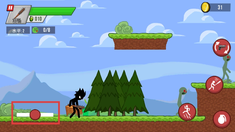 1、通过左侧的虚拟摇杆控制火柴人移动,在场景中探索,寻找僵尸。