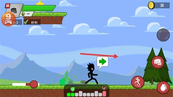 1、按照绿色箭头的指引继续移动,在此过程中注意观察下方的状态条,确保角色状态平稳,并且尽可能积累金币(比如从36枚增加到40枚)。