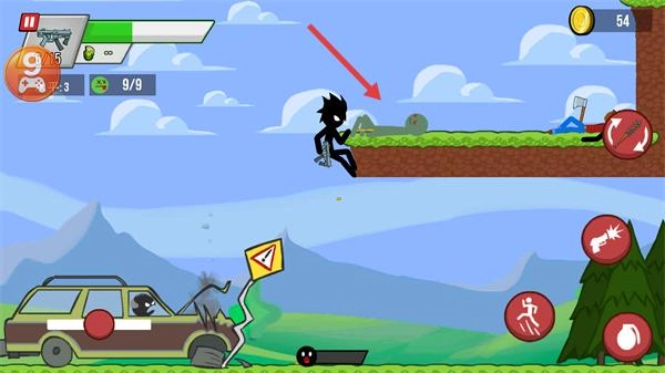 3、利用新武器攻击行进途中遇到的僵尸,结合移动、跳跃动作,高效消灭敌人以推进关卡。