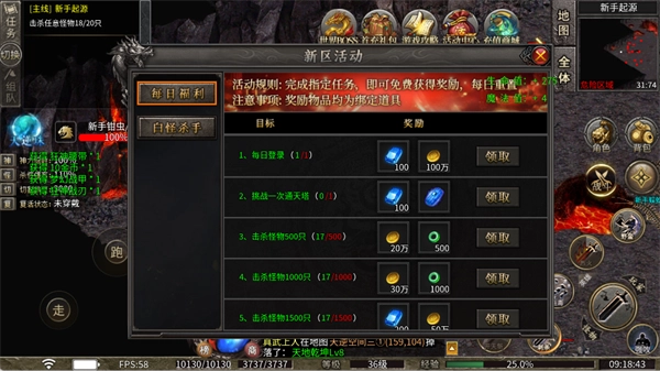 5、完成日常登录、通关天关、击杀怪物等任务,可领取钻石、金币、经验丹等奖励,每日重置需及时完成。