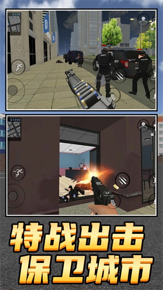 《特战勇者无敌》是一款以守护城市为主题的射击游戏,玩家将扮演一名精英特战队员,负责清除街头的犯罪分子,保护城市居民的安全,需要穿梭在城市的大街小巷,从紧张的街头交火到高风险的救援行动,每一个任务都考验玩家的反应和操作能力,完成任务可以获得资源,用来升级装备和武器,让玩家的战斗力越来越强。