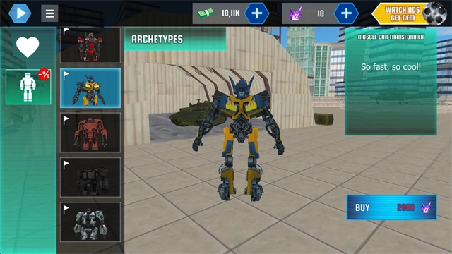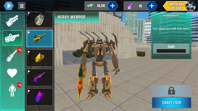 3、装备商店自定义:可购买不同形态机甲与武器(如高伤激光炮、速射机枪),攻击力差异大,打造专属战斗风格。