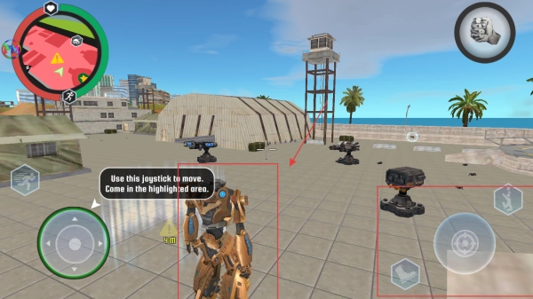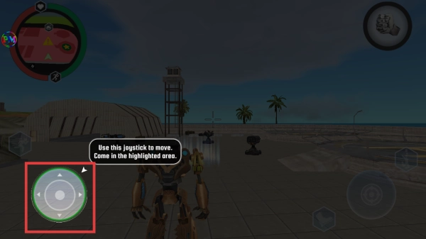2、进入游戏后,根据提示,通过左下角的虚拟摇杆控制角色移动。