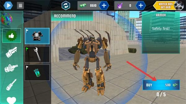 2、在商店的【RECOMMEND】板块,消耗【500】货币点击【BUY】按钮,购买推荐装备增强机器人的防御属性。