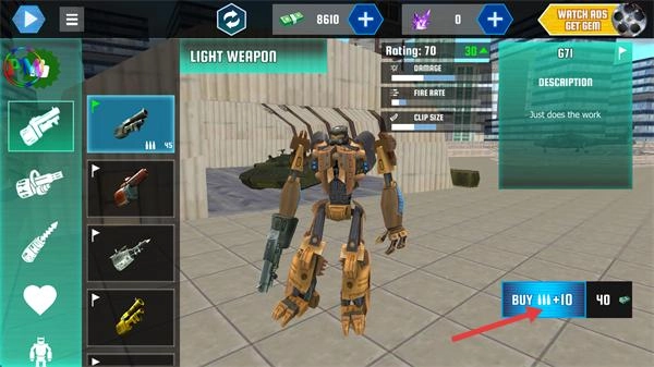 3、切换到【LIGHT-WEAPON】板块,消耗【40】货币点击【BUY-MU+10】,为机器人配备轻型武器提升输出。