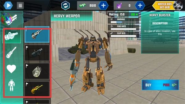4、进入【HEAVY-WEAPON】板块,选择重型武器后点击【BUY】,为机器人装配高伤害重武器,强化战斗实力。