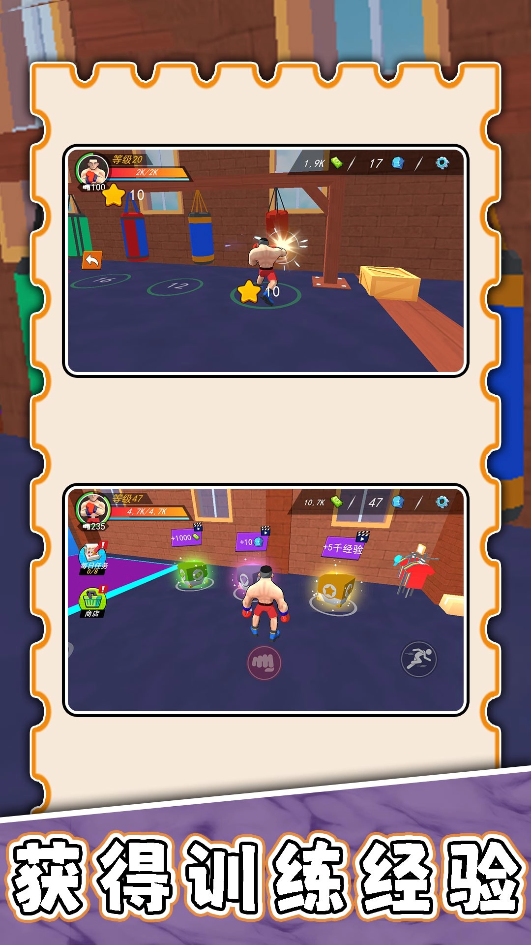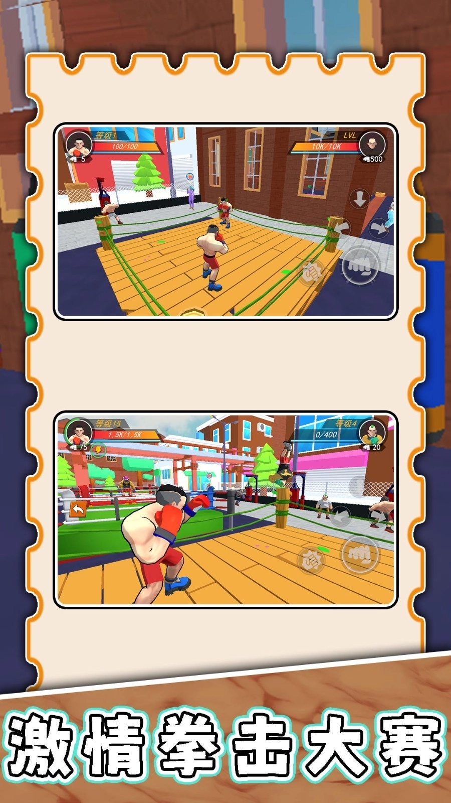 3、每场胜利都可获得经验与新招式,并能解锁更换酷炫的拳套与个性化角色造型。