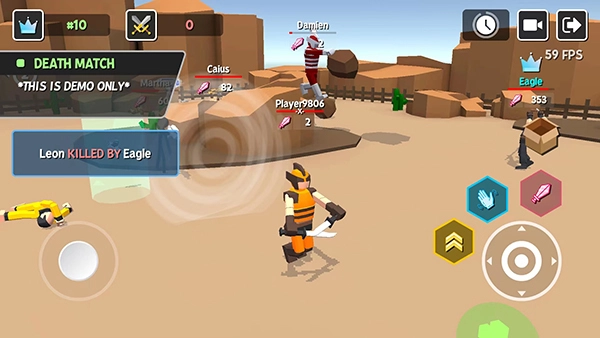 进入对战界面后,我们能借助左下方的轮盘操控角色移动,右侧则依次排列着跳跃、拾取以及切换武器的按钮。