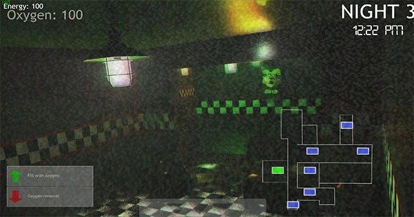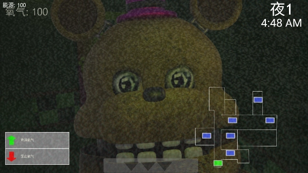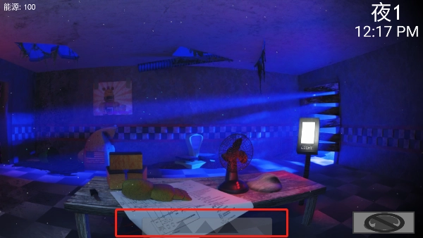 进入摄像头视角后,点击右下角的蓝色方块就能切换摄像头的监视范围。当看到面包熊时,你得屏住呼吸,留意它所在的位置,之后再次点击下方的三角图标,把视线重新拉回房间。