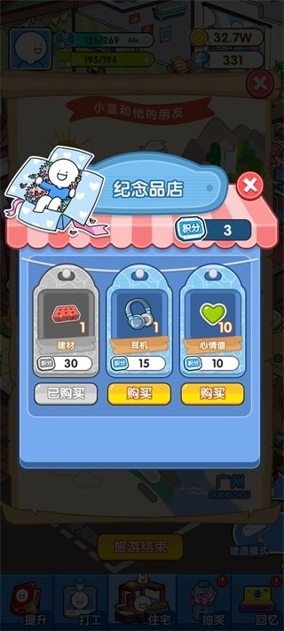 建议积累不少于30积分,若未达标可提前结束并重新开始;30积分可用于换取建材、汽车零件及收藏品——前两者是前期开荒阶段的关键物品,后者则能提升角色好感度上限(这也是收藏爱好者的心头好)。15积分对应的材料可作为礼物,可根据实际情况决定是否兑换;10积分的道具则建议在积分充足时再考虑换取。