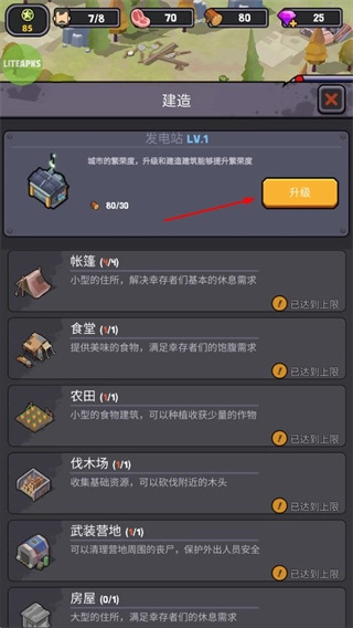 在建造界面,你可以对发电站之类的建筑进行升级,以此提高城市的繁荣度,同时也能够建造帐篷、食堂、农田、伐木场、武装营地、房屋这类设施。