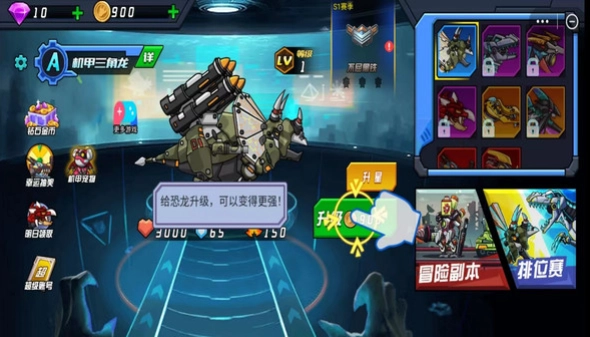 1、进入游戏后,您首先需要获取并选择心仪的机甲恐龙,在基地中利用战斗获得的资源来强化它的属性、解锁或升级其独特的炫酷技能。