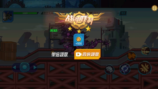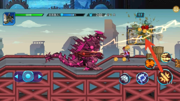 进入关卡战斗环节,可选择剧情模式或挑战模式开启关卡;借助虚拟摇杆操控机甲恐龙的移动方向,点击技能按钮即可向场景内的敌人发动攻击。