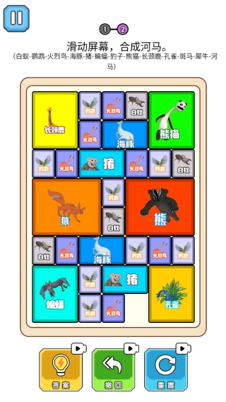 在疯狂动物华容道玩法里,玩家需要移动不同动物形状的方块,通过合并让它们进化,只要最终成功合成出孔雀就能通关。