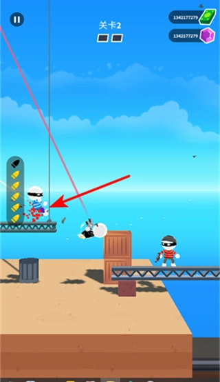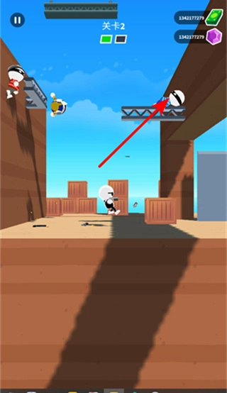 点击屏幕就能启动,角色会自动跳动并进入慢动作状态,你只需要在红线对准敌人的瞬间点击射击就行。整个操作简单明了,不用复杂学习,新手也能很快上手。