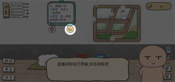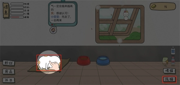 8、当左上角的小猫健康度不良时,玩家可以点击洗猫来为小猫进行洗漱;