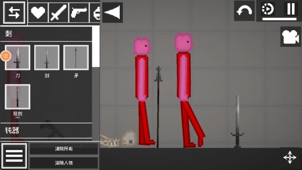 4.如下图所示,工具栏里设有角色、剑、枪械、炸弹等多个分类栏,玩家能够点击角色或武器道具并将其放置在地图上,从而自由地进行游玩。