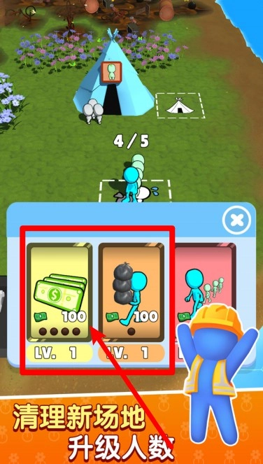 1. 点击左侧的金钱图标,可消耗金币来提升营地的人数上限,这样就能让更多小矮人一同行动,从而显著提高清理效率。